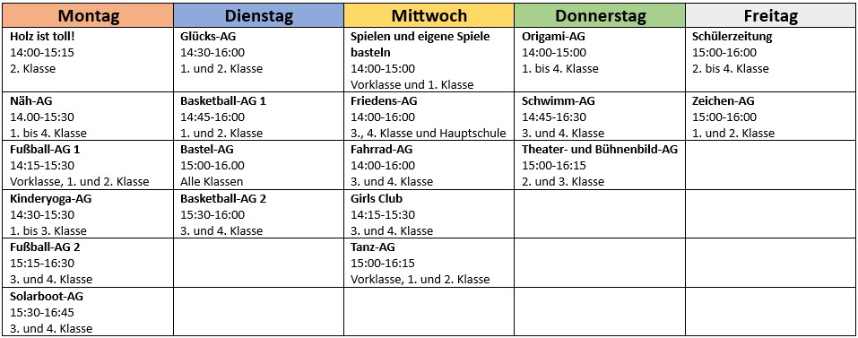 Bei der Planung des Nachmittagsangebotes achten wir darauf, dass täglich AGs für möglichst alle Jahrgangsstufen angeboten werden und über die Woche verteilt verschiedenste Bereiche (Musik, Kreativität, Sport, Sprachen, Tanz, Naturwissenschaften) abgedeckt sind.